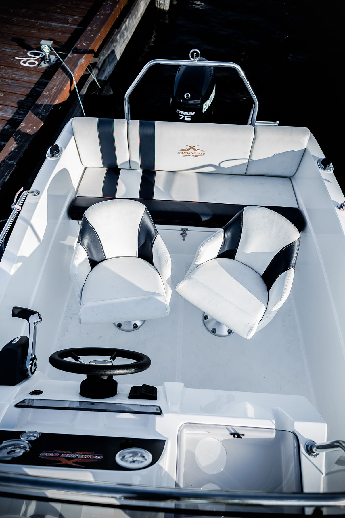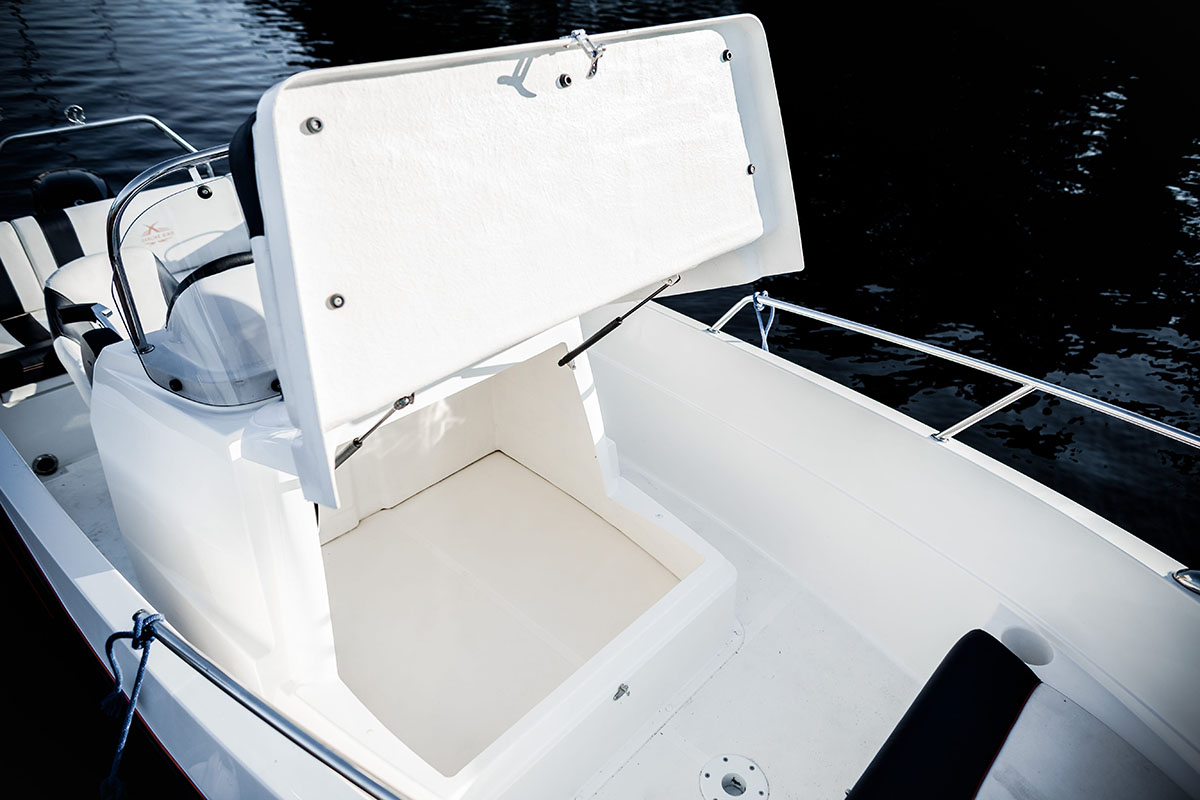 Podczas prowadzenia łodzi sternik zajmuje miejsce w wygodnym obrotowym fotelu z regulowaną wysokością. Łódź można doposażyć w fotel dla pasażera.